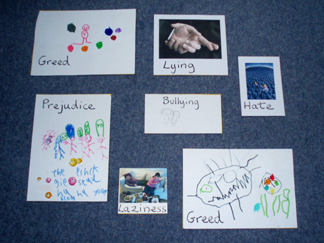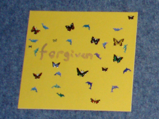 In Junior Church we talked about the things we do that cut us off from God. The children suggested "Greed", "Bullying" and "Lying" and drew pictures to illustrate their ideas. We also discussed how we can ask for forgiveness from other people and from God, perhaps by saying sorry or doing something to put things right. We stuck the pictures onto yellow card. The children wrote the word "Forgiven" on the back of the cards in gold pen and decorated them with stickers.