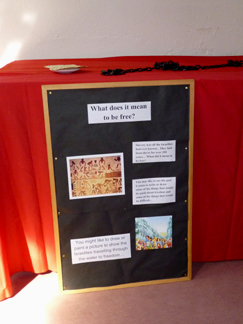 Exodus: All Age Worship with Prayer Stations![]() Theme:Exodus, with a focus on moving from slavery to freedom Story:The story of Exodus: Moses asking Pharoah to let his people go, the escape from Egypt and the crossing of the Red Sea. Bible reading:Paul's letter to Philemon, verses 8 - 21 Adult reflection:A reflection on Paul's letter to Philemon from the Bible Reading Fellowship notes Station 1: What does it mean to be free?![]() On the table display was a chain and a piece of matsos as a reminder of the Israelite's hurried journey on their way to freedom. Words:Slavery was all the Israelites had ever known... They had been slaves for over 200 years... What did it mean to be free? Activity:You may like to use the post it notes to write or draw some of the things that would be good about freedom and some of the things that would be difficult... Station 2: Let my people go![]() This station was created by using a variety of green cloths draped over screens (and the church's metal candle screen!) At one end was the wooden cross. At the other was a lit candle. Words:We all have things that weigh us down. Worries, cares, regrets... Prayer activity:You may like to choose a stone to represent the things that weigh you down and leave it at the foot of the cross... You may like to walk back between the walls of water and think about the Israelites walking through the water to freedom... Station 3: Could there be a scientific explanation?![]() This station was set up outside. A shallow tray of water was placed on the ground. Words:Then Moses stretched out his hand over the sea, and all that night the Lord drove the sea back with a strong east wind and turned it into dry land.The waters were divided, and the Israelites went through the sea on dry ground, with a wall of water on their right and on their left. The researchers Drews and Hans from the US Centre for Atmospheric Research and the University of Colorado had developed a theory about how a strong north easterly wind, blowing all night, might have parted the waters of the Nile (not the Red Sea). Their explanation was included on the board. Activity:You may like to experiment yourself to see if you can make a dry path for the Israelites to cross over... Station 4: What does it mean to be free?![]() Words:When Pharaoh's horses, chariots and horsemen went into the sea, the Lord brought the waters of the sea back over them, but the Israelites walked through the sea on dry ground. Then Miriam the prophet, Aaron's sister, took a timbrel in her hand, and all the women followed her, with timbrels and dancing. ![]() Miriam sang to them: "Sing to the LORD, for he is highly exalted. Both horse and driver he has hurled into the sea" Activity:What would you use to make a prayer station to show what it was like to be freed from slavery? "There's two ways. This way is blocked but they can go a different way. There's always another way." ![]() How well did it work?The station outside suggesting people experimented to find a way across the Red Sea was popular with the children who tried out earthquakes, tremor and wind... Some of the adults were persuaded to have a go as well! This station also sparked a discussion about what makes a miracle. The children also responded well to designing their own prayer station, while the adults discussed what things can enslave us... Sarah |