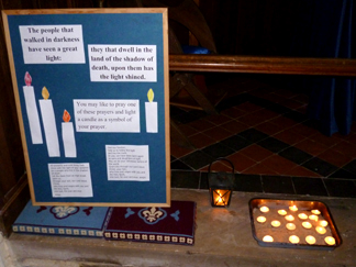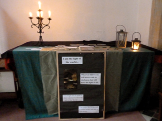 Light: All Age Worship with Prayer Stations![]() Theme:Light, with a particular focus on Jesus as the Light of the World Story:The story used symbols and pictures to combine the first day of creation "Let there be light...", with Isaiah's prophecy "The people who have walked in darkness have seen a great light" and Jesus saying "I am the Light of the World." Bible reading:John Chapter 1 verses 1 - 14Adult reflection:A reflection on the Light of the World painting by Holman Hunt. Station 1: "I am the Light of the World..."![]() Words:I am the light of the world... Whoever follows me will never walk in darkness, but will have the light of life... We also had a selection of quotes and sayings about light for people to read. Activity:You might like to paint or draw a picture to show the Light of the World... You might like to decorate a candle holder and take a light home... We also had the laptop set up with a variety of images to illustrate the theme of the Light of the World. Station 2: The people that walked in darkness have seen a great light...![]() Words:The people that walked in darkness have seen a great light: they that dwell in the land of the shadow of death, upon them has the light shined. Prayer activity:We had a couple of prayers using the symbolism of light on the board. People were invited to pray one of the prayers and to light a candle as a symbol of their prayer. (This station was manned.) Station 3: Jesus, the Light of the World![]() Activity:This station was left bare, with an invitation: "What would you use to create a prayer station that shows Jesus as the Light of the World?" A variety of symbols, toys, coloured underlays etc were around for anyone who wanted to create their own prayer station on the theme. Three children chose to do this; their responses are shown below, together with what they said about their prayer stations. Everything they used had some kind of symbolic value, for example representing the darkness or the desert. ![]() Jesus is the light of the world. That's Jesus, the yellow figure. His light is the light in the desert, in the river, on mountains – everywhere. He is also the light for people and animals and plants. (10 year old boy) ![]() All the darkness in the world: animals being captured, prisons, wars, hurricanes. A tiny bit of light can change all that. (8 year old girl) ![]() These are the little Christian boys. This tower is the house of darkness. Light comes down from the sky. The Christian boys are cheering. Everyone is happy. The darkness is going back into the sky. (5 year old boy) Sarah |