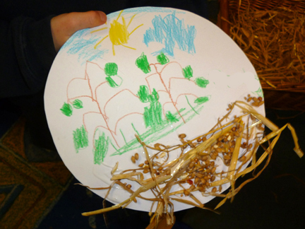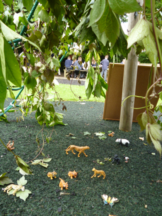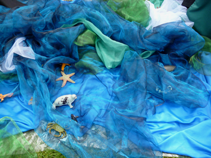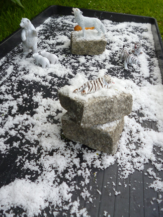 Created World![]() We wanted an event where the children were focused not just on the biblical story of Creation but also on the depth and breadth of the created world. We began with the Godly Play creation story and then the children were sent off to explore seven stations, each with a focus on different parts of the world. This was a good opportunity to use the school's outdoor area, which included a pond, a sand pit, mounds and outdoor equipment that we could use. The stations were: Desert, Ice, Water, Sea, Mountain, Grassland and Woods and Forest. Each station had a board with words, pictures and reflective questions; the older children were encouraged to read the boards and think about the questions. The classes were then brought back together and given the opportunity to make a creative response. Three classes came to the event: the two oldest classes (8 – 11 year olds) and the youngest class (4 – 6 year olds.) Introduction![]() The classes were lined up facing a line of black cloths, attached to the apparatus. "This is our world… we have always known it. Even as tiny babies there were things we could see and hear and touch and taste and smell. But it hasn't always been like this. Long ago there were no buildings here… no cars… no people… no animals… no birds… no green and growing things… no earth… no water… no time… Almost every culture/people has a story or myth about the beginning of the world. Myths are stories that tell us how things are, not in a way that you can touch or see, but in an underneath way that tells us a different kind of truth. This story is the one told by the Christians and the Jews… What was it like in the beginning? We don't know and it is hard to imagine… But it was dark. We are going to try and imagine the beginning by going between the dark cloths towards the light." The children went between the black cloths, and then formed a semi circle where the storyteller told the biblical story of the seven days of Creation using the Godly Play creation cards. They were then sent off to explore the different areas. 1 Ice![]() Fake snow was sprinkled into a long black tray. We added blocks and ice animals such as polar bears and arctic tigers. Plastic sea polar animals such as seals and whales were frozen into blocks of ice and placed in a small paddling pool. We provided a small wooden mallet which the children used to smash the ice and free the animals. (We included this activity as we had used it in the past and knew how much the children enjoyed it!) Words and questionsAntarctica is the coldest place on earth… it is a barren icy desert... Sometimes the temperature drops below minus 60 degrees Celsius. But even in very cold places, life exists. In the seas around Antarctica there are seals and penguins. Tiny wingless insects survive on the rocks, "sleeping" when the temperature drops. I wonder if you have ever been in a really cold place? 2 Desert![]() We used the school's sand box to set up a desert area. Bowls of cacti (by chance in flower) were placed around the edge. We added camels, lizards and a large snake (which was very popular!) Words and questionsThe desert is a dangerous place… It is always moving, so it is hard to know where you are. Water is rare. Little grows there. In the daytime it is hot but at night it is very cold. The wind can blow the sand into raging sandstorms. People do not go there unless they have to. I wonder if you have ever come close to the desert? 3 Water![]() The school has a pond and wild life area, where the children were able to see real frogs and tadpoles. We did add a variety of water animals - toads, newts and duck billed playtpus around the edge. This was the one station which was monitored by an adult. Words and questionsWater is essential for life… The saltwater oceans contain 97% of all the water on earth. Less than 1% of water is the fresh water people need to live. Earth is the only planet in the solar system with a large amount of liquid water on the surface. Do you think there is life elsewhere in the universe? Can there be life forms that don't need water? 4 Sea![]() We put down plastic sheeting and added blue and green organza and white netting. The two tyres that bordered it were draped in cloths to give the impression of waves. Sea creatures were placed amongst the cloths. Words and questionsThe sea is always changing… Some days it is calm and gentle, on others it is wild and stormy. We cannot control the oceans… but once Jesus stood in the front of the fishermen's boat, raised his hand and shouted "Peace, be still" to the storm. I wonder if you have ever come close to a wild rough sea? I wonder what other things we can't control? 5 Forest![]() We hung the triangular scramble net with vines and creepers which created a dark place. Some animals were placed on the ground, others were wired to the net or hung on string. Words and questionsThe rain forest is home to more than 5 million different kinds of life: animals, insects and plants. Half of all known forms of life live in the rainforest. More than half of the rainforest has been cut down for wood or for farming. We live in a hungry world. How far are we responsible for the created world? Is there anything we can do? 6 Mountain![]() Crates and cones were used to create extra height on the school's mound; they were then draped with hessian and green cloths. Mountain animals such as sheep, goats and deer were then added. Words and questionsThings look different from the top of a mountain… As you climb higher the air becomes thinner and colder. Looking back, you can see the way you have come far below. Sometimes people climb mountains to come close to God… I wonder if you have ever stood on top of a mountain or a high hill? 7 Grasslands and Woods![]() The school has a raised grassy area on which we placed a variety of woodland and grassland animals from around the world - from lions to kangarooos, squirrels to elephants! We