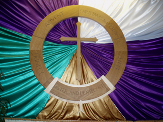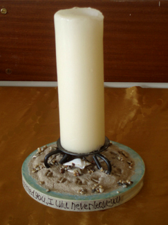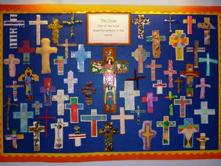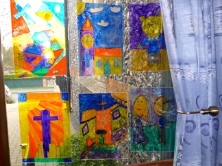 In the entrance hall![]() The church year:This display was created by a local craftsman, who was also a parent. It is based in part on the Godly Play Circle of the Church Year and shows the colours of the church seasons - purple for Advent and Lent, white for Christmas and Epiphany, gold for Easter and Pentecost, green for Trinity.The school planned to add to the display with children's work for the appropriate seasons. ![]() Crosses:Every child in the school was invited to make and decorate their own cross. A wooden painted Latin American cross was used as a centre piece and a selection of the children's crosses arranged around it. The children used a wide variety of materials - one child even made one out of flowers!A special candle![]() Our end of term leavers' service was based around the poem "Footprints". In response to this one parent made the school a special candle holder. The base has sand, shells and tiny footprints marking a path in the sand. Around the edge are the words "I carried you, I will never leave you." Painted glass![]() As part of the school's 150th anniversary celebrations the children were asked to do a glass painting that represented the school and the local area. Several of the pictures were chosen to be displayed at the entrance to the school. They were hung in the window so that the light could shine through them. |