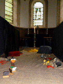 All Age Worship with Prayer Stations![]() All Age services need to provide worship opportunities for both children and adults. But how can you do this in small rural churches where it is hard to find sufficient clergy or lay ministers to preach and take services and the number of children can vary from none to ten? One solution has been to develop a monthly All Age Service with prayer stations. Our prayer stations are visual, interactive displays on the theme. They are set up in different places around the church - for example one month we may use the transept and the chancel, another month the area around the font and the pulpit. In summer months we try to use the churchyard as well! This photo shows Jacob's dream and everyone (children and adults) was invited to reflect on a time when they felt close to God, to tie a ribbon on the ladder as a symbol of this or to create a picture or pattern to symbolise this. Each prayer station has a board with pictures, brief words, reflective questions and suggestions for prayer and play activities. Sometimes children and adults will spend all the time at one station, at others they will visit them all; this is left open for people to make their own decisions. ![]() This photo shows the good shepherd leading the sheep through the valley of the shadow of death. People were invited to add objects and symbols to the display. Structure of the serviceWe begin together, sitting in the round. We have a welcome, hymns and songs and the confession altogether. This is followed by a story, usually in the style of Godly Play. Some then go straight to the prayer stations and taking part in the accompanying activities, while others stay for a Bible reading, reflection and intercessions before doing this this. We come back together for the creed or statement of belief, our prayer tree and Lord's Prayer and the final hymn or song. ![]() How well does it work?The children enjoy the variety of activities and also the opportunity to take part alongside their parents/carers. It took longer for the adults to get used to this way of working but we are beginning to find that this approach works even on the weeks when we have no children and that it adds depth to what would otherwise be quite a "thin" service. The informal atmosphere of the service works well with those who aren't used to a more formal service. On the downside, it does take time to prepare and set up. The prayer stations are left up for the following week for visitors to the church. Themes:Joseph: Our first attempt at using prayer stations focussed on the theme of forgiveness. Hunger: We used the story of Elijah and the widow of Zarephath, and also looked at hunger in the world today and what can be done about it. Light: Jesus the Light of the World. What does this mean and how would we show it? Exodus: What does it mean to be free? Slavery was all the Israelites had ever known... Good Shepherd: Prayer stations including green pastures and still waters, the importance of being known by name and the valley of the shadow of death. Seasonal Prayer Stations:Advent: The prophets: Isaiah, Jeremiah and Ezekiel: A time to prepare for Christ's coming Epiphany: A Liquid Worship service with prayer stations to celebrate the coming of the wise men. Palm Sunday: Six stations including confession, prayer, word and reflection all based around the theme of Palm Sunday Good Friday 1: These ten prayer stations were used in an All Age Service on Good Friday. They include the triumphal entry into Jerusalem, Jesus in the temple, the Garden of Gethsemane and the Passion. Each station included a play activity (such as making a dove or a cross) and a prayer activity (lighting candles or making a knotted string whip). Good Friday 2: The Way to the Cross: A look at the story of Good Friday from the point of view of the people who particiapted in it, including Judas, Simon Peter, Pilate, Simon of Cyrene and Mary. Good Friday 3: These prayer stations were used as part of a Liquid Worship service for Good Friday. They include Jesus before Pilate, the road to Golgotha and the crucifixion... There were opportunities to taste vinegar, bang in nails and make crowns for Jesus the King Good Friday Reconciliation: Five different stations were used to reflect on the story of Good Friday. Each one was linked with the rebuilding of Coventry Cathedral after the second world war by using prayers, images and stories. There were opportunites for prayer and creative response. Pentecost: The Holy Spirit - inspiring, encouraging, comforting... Harvest: The Parable of the Sower: Prayer stations for the sower based on the themes of the path, the rocks, the thorns and the good earth Bible Sunday: Books of the Bible, writers of the Bible, the Bible through the ages, Mary Jones, the Bible in danger Remembrance: Courage: The story of Daniel was linked with the First World War, focussing on different kinds of courage: physical courage (individual bravery, Daniel in the lion's den); enduring courage (the Israelites in exile in Babylon, life in the trenches) and moral courage (Shadrach, Meshach and Abednego, conscientious objectors). Remembrance and Peace: Two simple prayer stations for Remembrance Day, one focussing on remembering the effects of war and the second on the need for peace. |